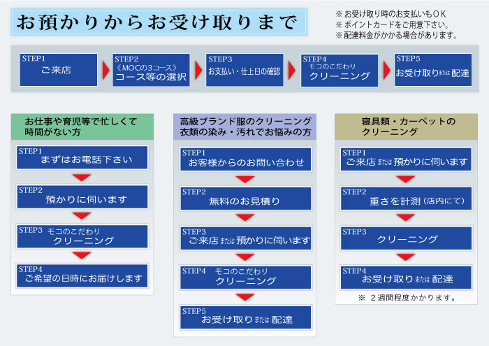朝は忙しいので衣類を預けに行けない、帰りが遅かったり疲れたりしてなかなか取りに行けない等、お客様のライフスタイルに合わせて集配(宅配)致します。