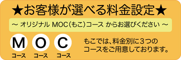 当店では、服の種類や汚れに合わせて、料金別3つのコース(MOCコース)をご用意しております。大切な洋服や着物をいつまでも良い状態で心地よく着たい、毎日の仕事着をいつも快適に気持ちよく着たい・・・というお客様の思いやご要望を大切にしながらより良い品質、より良いサービスを心掛けております。