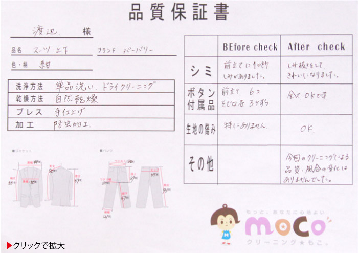 ・普通のクリーニング屋さんだと、ブランド服を持っていくのは少し心配なのですが、こちらのお店は「品質保証書付きのブランド服専用のコース」があるので安心でした。採寸後、「単品洗いのソフトクリーニング」となるので、型くずれの心配もありませんでした。仕上りもとてもよく、満足でした。またお願いしたいと思います。