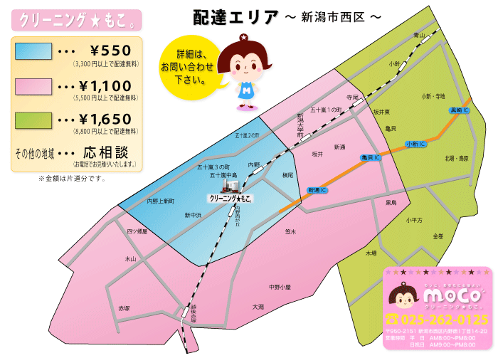 新潟市のクリーニング店です。衣類の染み抜き、高級服・お着物のクリーニングなどでお悩みの方、染み抜き自慢「クリーニングもこ」にご相談下さい。西区を中心に配達もOK!